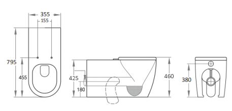 Raised Height 4.5/3 Liters Dual Flush Size: 795*355*425mm Trap-100: 160-290mm (Supplied) Single Flap Care Seat SC130 (Supplied) Optional Trap-60: 130-240mm JT43: 210-325mm P-Trap: 180mm