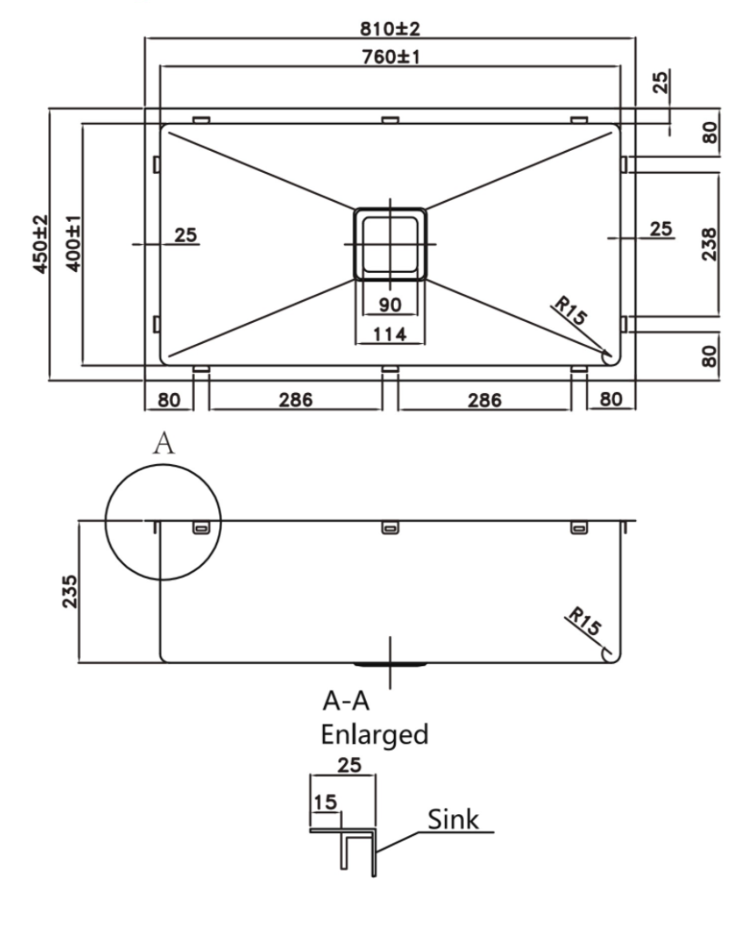 Universal Installation- Top or Undermount 1.2mm S.S 304 250mm extra deep bowl Bowl Size: 760 400 235mm Overall Size: 810 450 235mm
